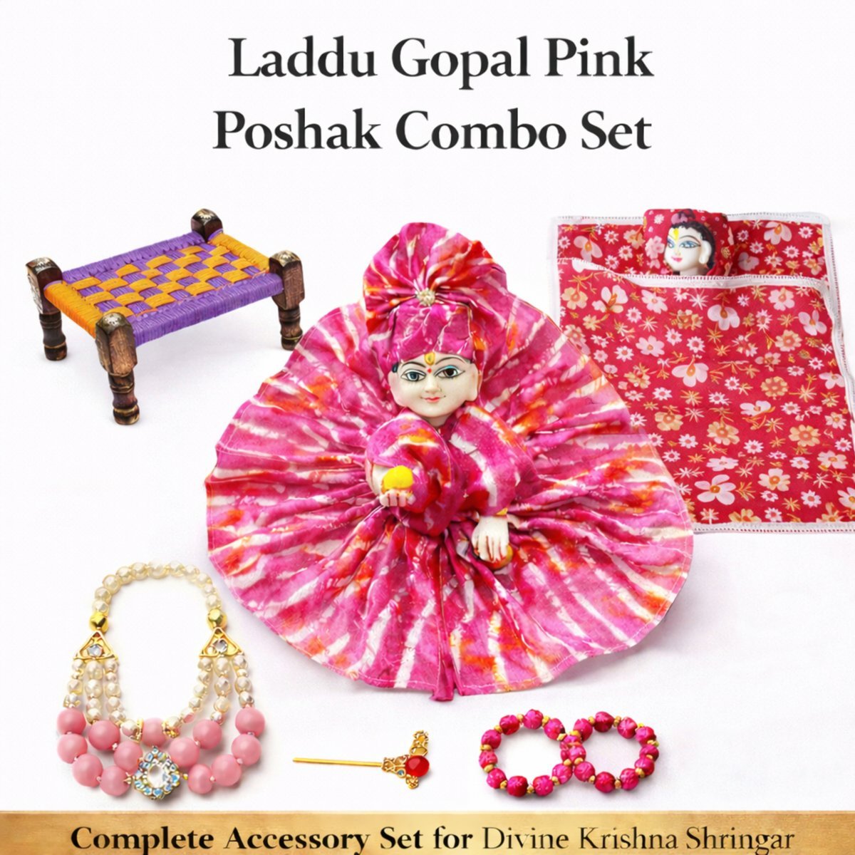 Elegant pink Laddu Gopal poshak combo set with pagdi, jewelry, bansuri, mini khaat, and pocket bed. Perfect for Krishna shringar and festive decoration.